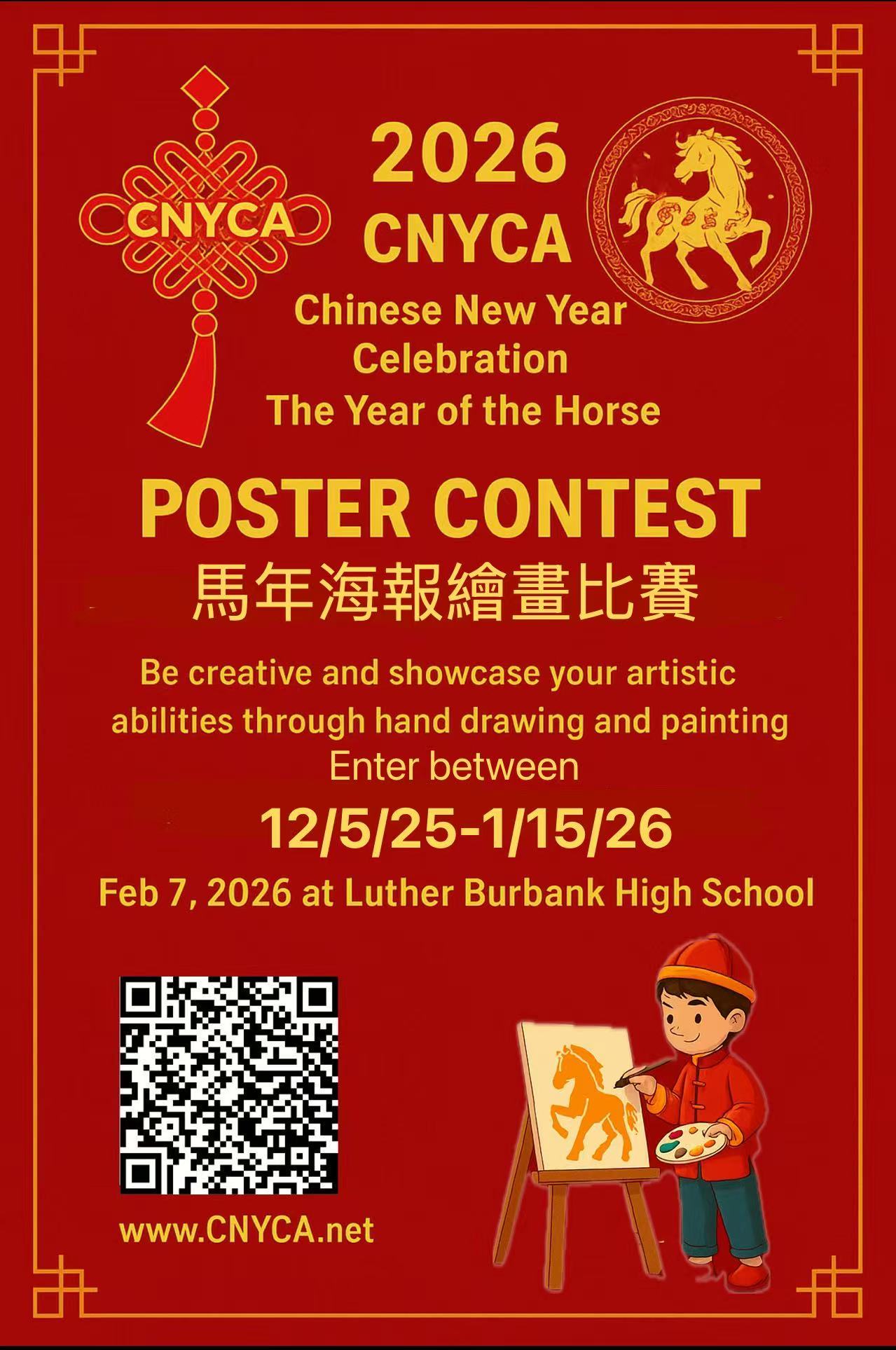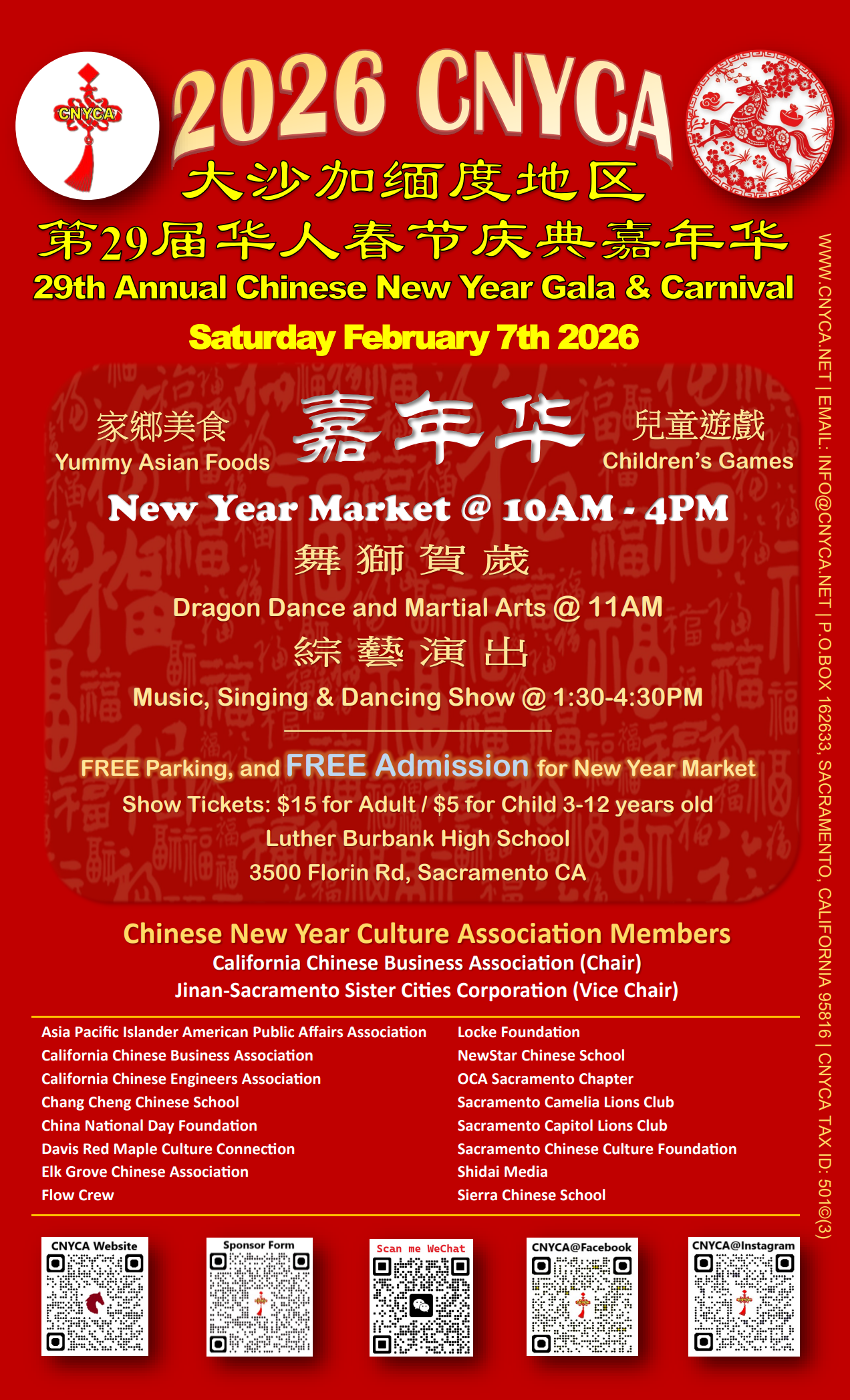 2026 CNYCA宣传视频: 2026 Promo Video 2026 CNYCA Program Book CNYCA 春晚节目单 CNYCA ON YOUTUBE 2026 CNYCA Poster Make a Donation to CNYCA via Zelle: 916-281-7538 2026 CNYCA EVENT When February 7, 2026 Saturday 10:00am - 5:00pm Where & Direction Luther Burbank High School 3500 Florin Rd, Sacramento CA Parking Free on site